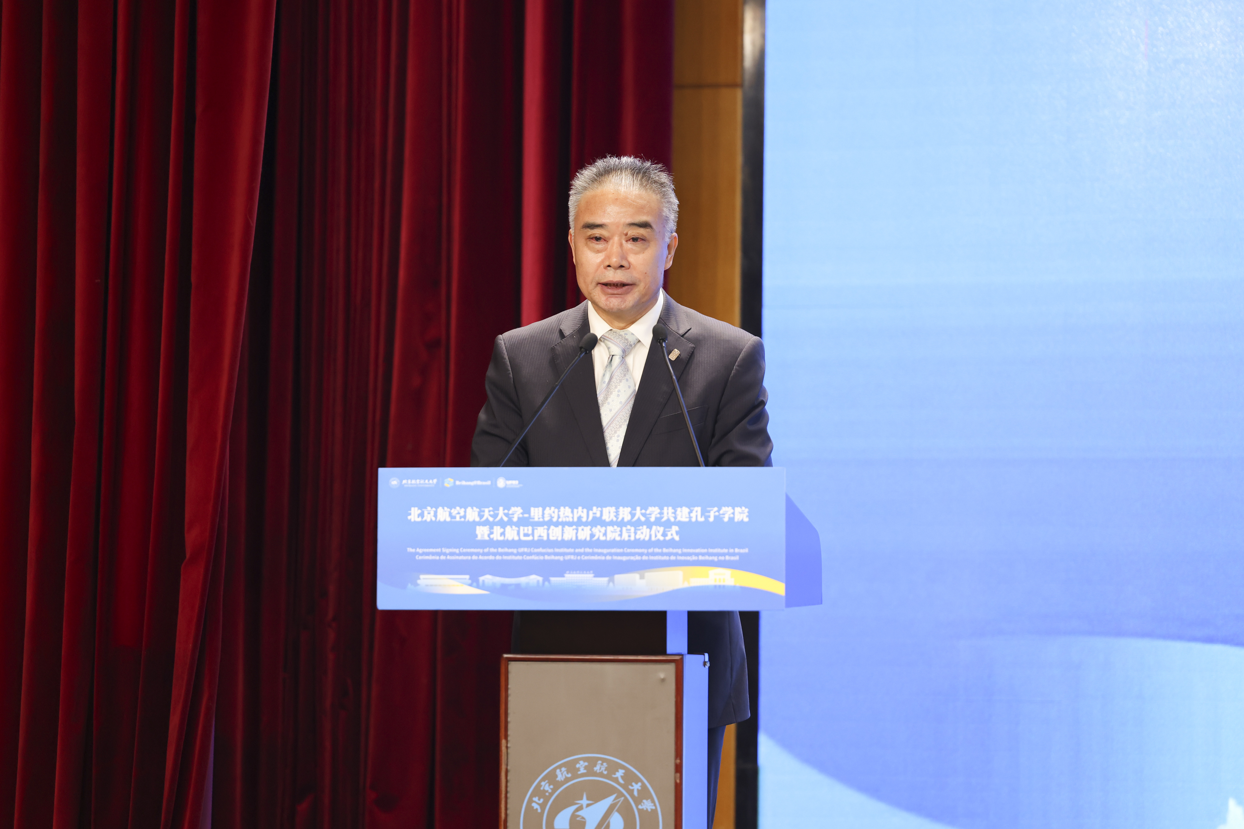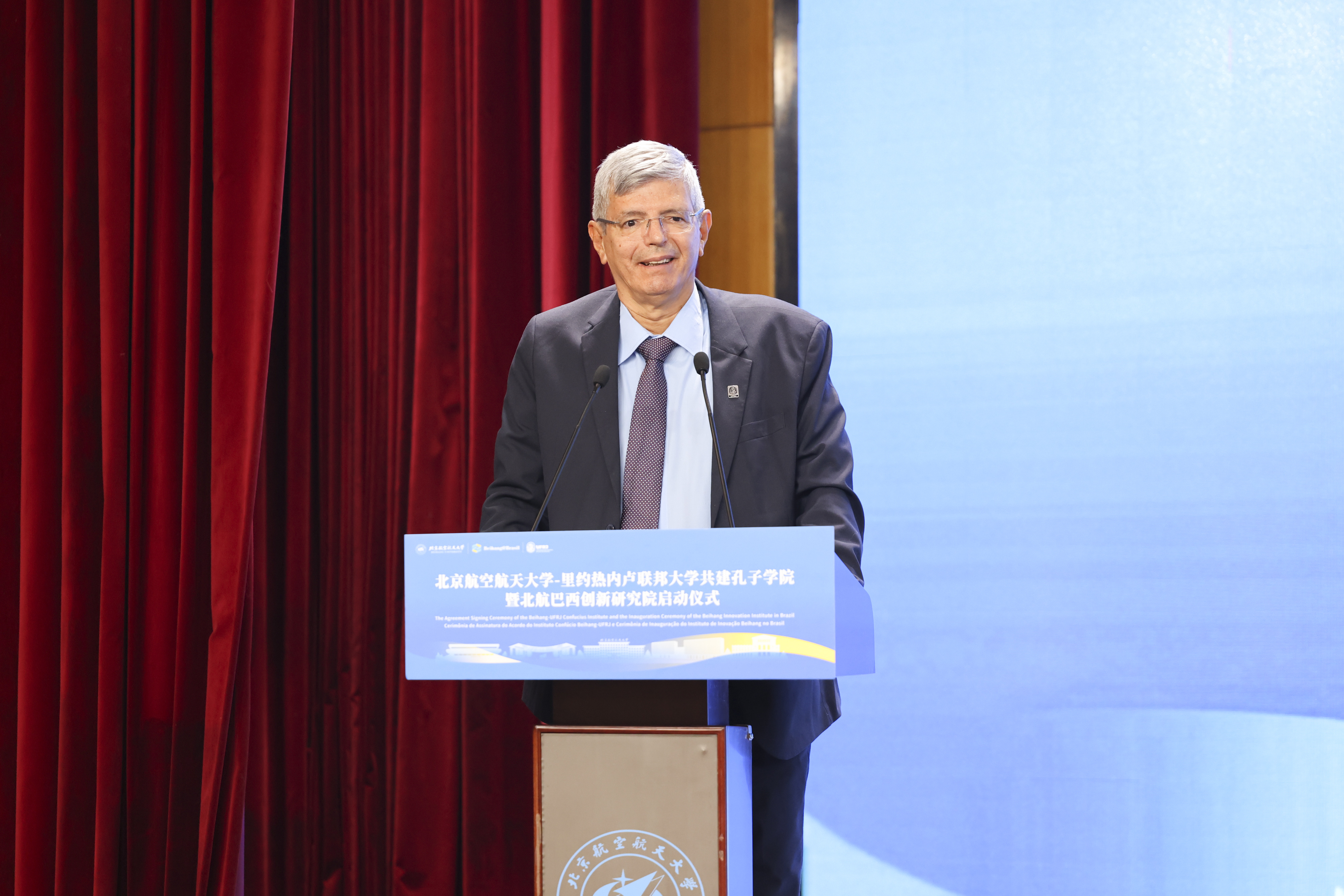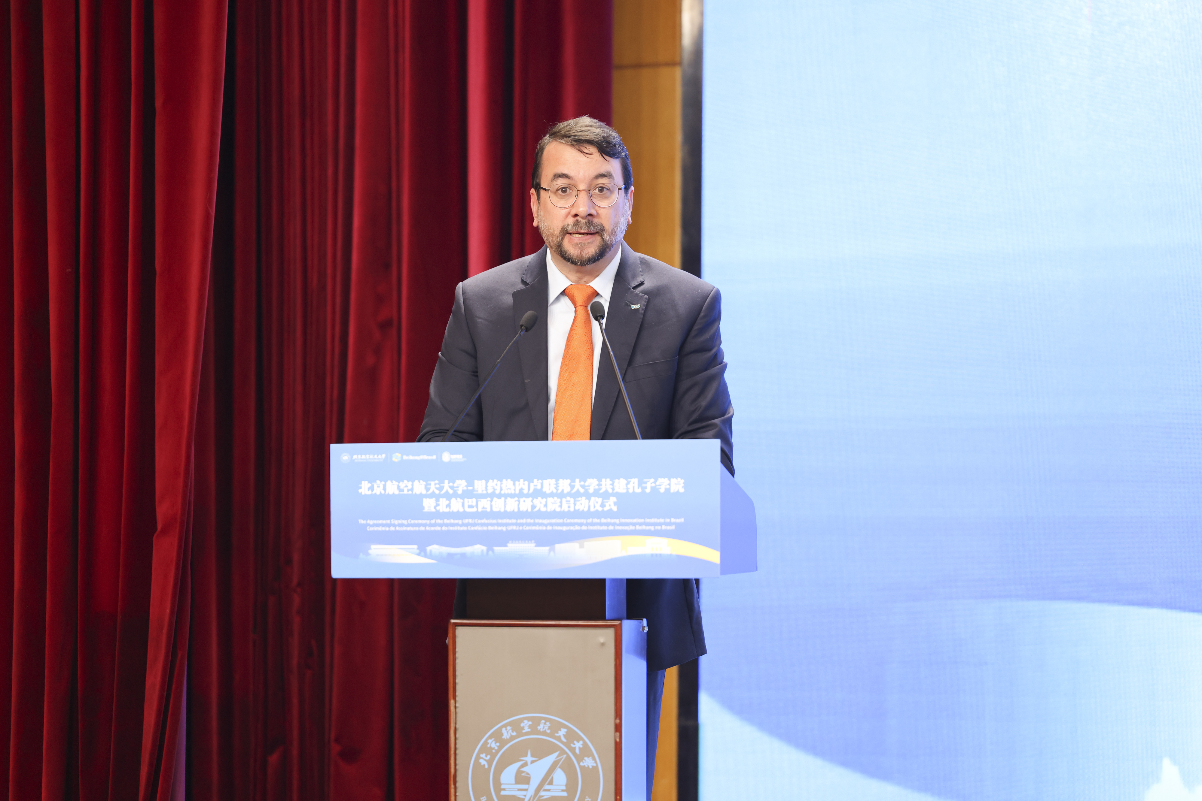 马塞洛·布雷加尼奥利在致辞中指出,北航-里约热内卢联邦大学孔子学院、北航巴西创新研究院和北航巴西中心宛如三座桥梁,将跨越山海,为巴西青年搭建起学习中文、触摸中华文化深厚底蕴的通途,助力他们在语言与文化的交融中拓展认知疆界。与此同时,这三个平台更将成为中巴科研协同创新的引擎,驱动双方在科技前沿领域并肩探索,为应对气候变化、资源短缺等全球性挑战凝聚智慧、输出解决方案。期待北航与其他巴西高校开展更多合作,撬动金砖国家教育科技合作的潜能,共同绘制金砖国家教育科技深度融合、协同发展的“实景图”,为人类社会可持续发展倾注源源不断的智慧动能。