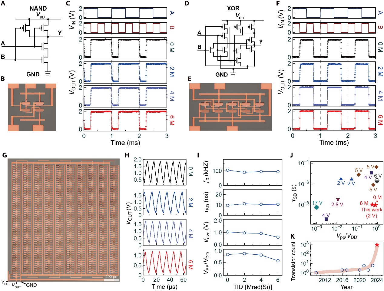 基于此,团队构建了包括反相器、与非门和异或门在内的多种逻辑门以及具有5、11和501个阶段的环形振荡器。实验发现,在高达6Mrad(Si)的辐射剂量下,所有器件均保持了完整的输出功能,特别是包含1004个碳纳米管场效应晶体管的501阶环形振荡器,其延迟变化很小(10.3 ± 0.8 ns)。