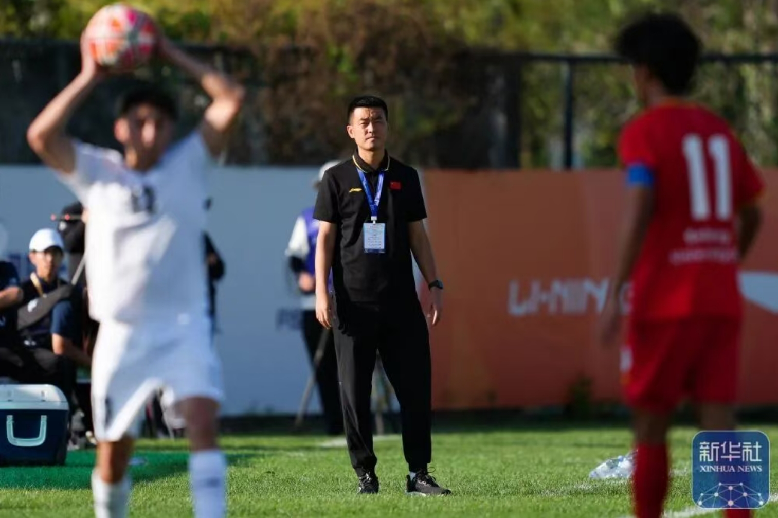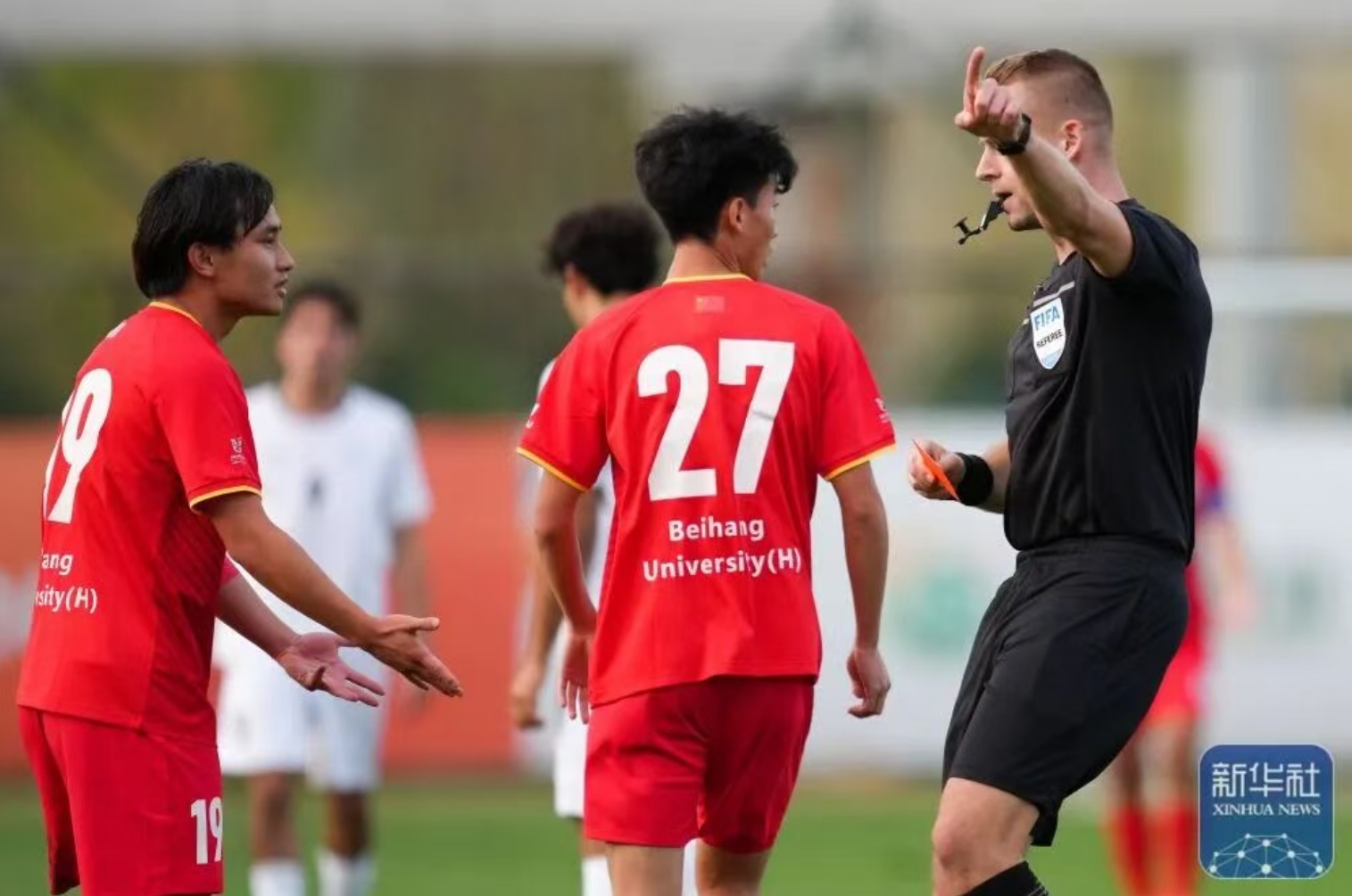 主裁判向北京亚州怡红院男足球员林扬(左)出示红牌。