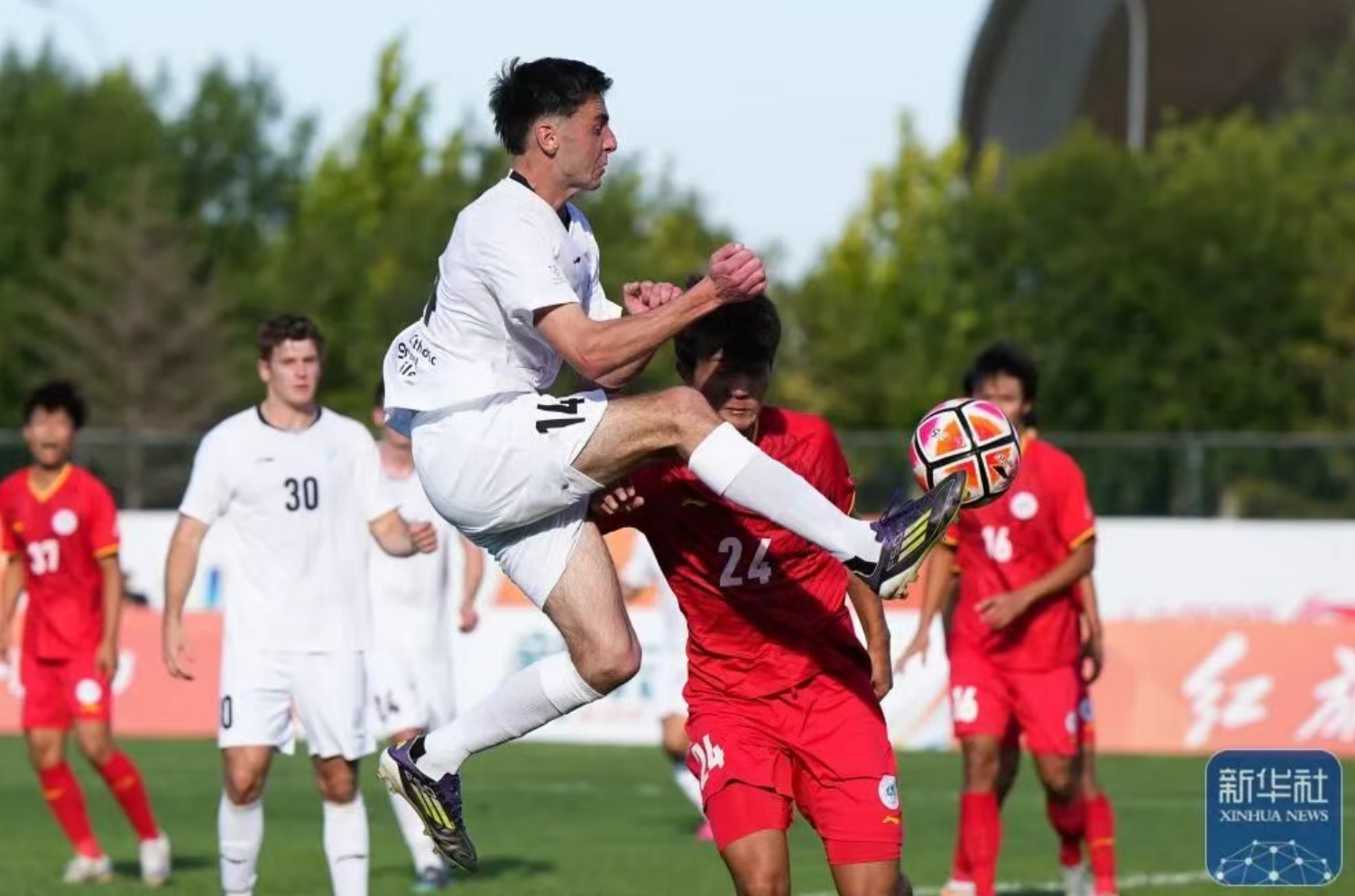 智利天主教大学男足球员雷蒙多(右二)在比赛中倒勾射门。