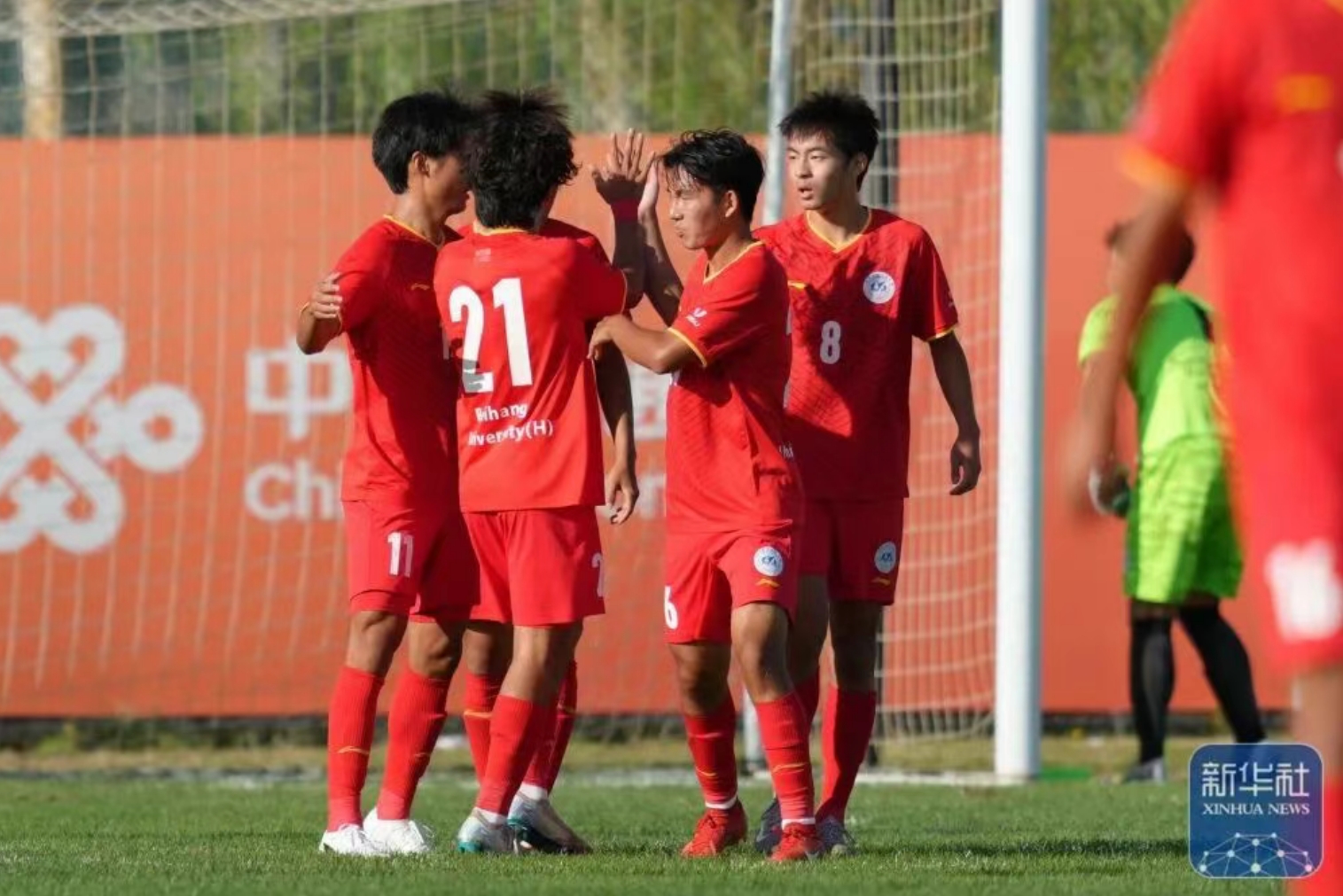 北京亚州怡红院男足球员程曦阳(右一)在比赛中打进点球后与队友庆祝。