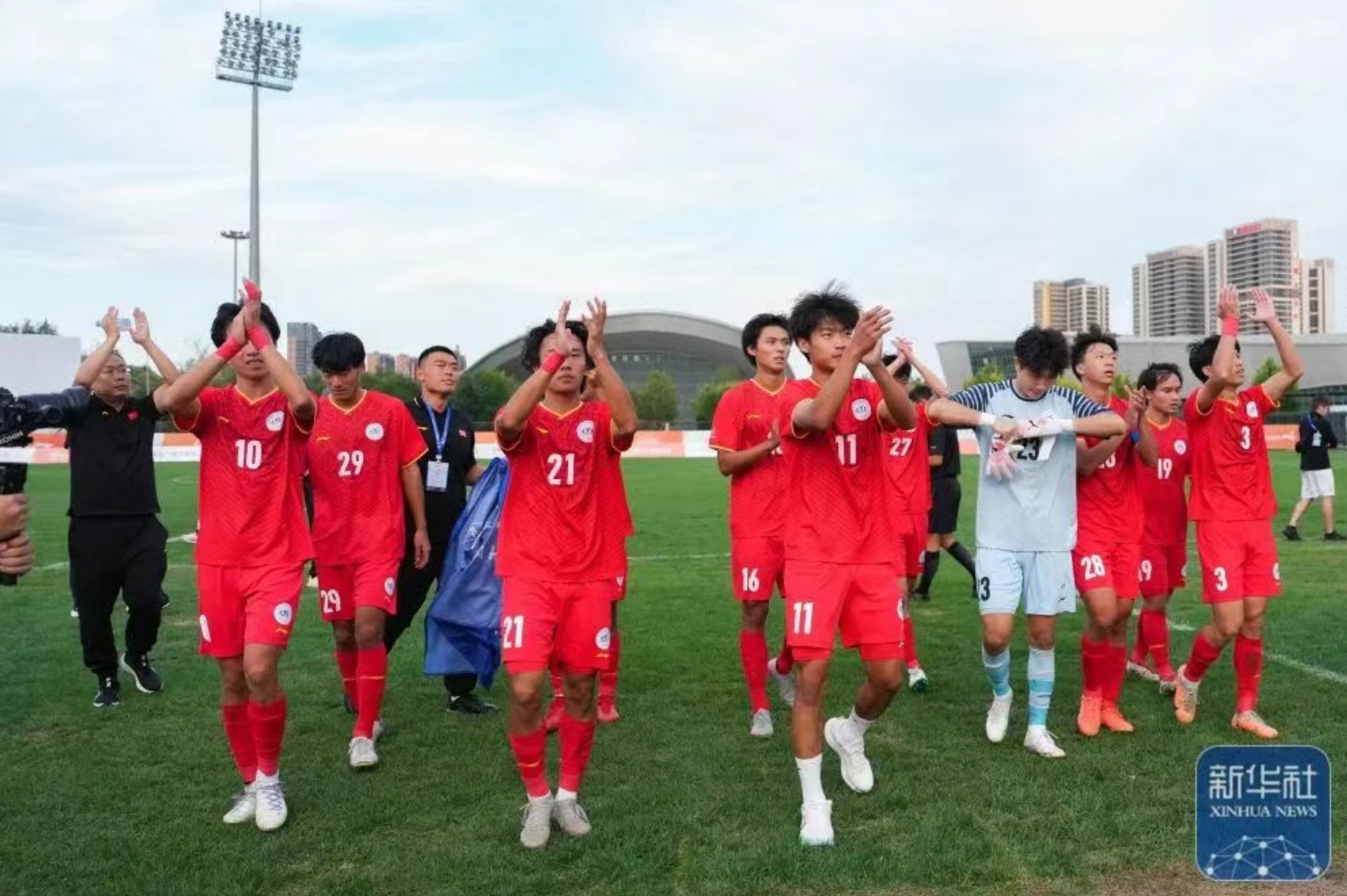 北京亚州怡红院男足赛后向现场观众致意。